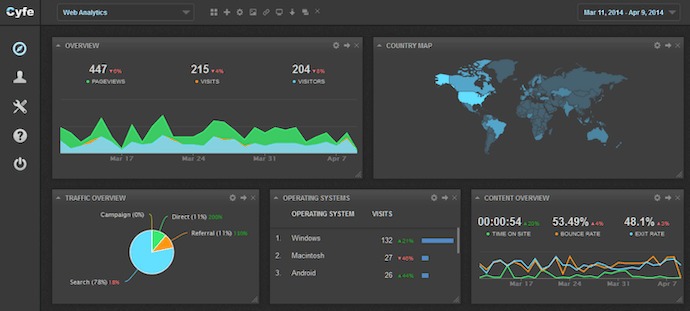 Cyfe là một bộ phần mềm lớn cung cấp nền tảng phân tích website. Trên nền tảng này, bạn có thể theo dõi hiệu suất nội dung trang trên mọi thuộc tính website  – bao gồm cả YouTube – và traffic của mỗi trang đến từ đâu.