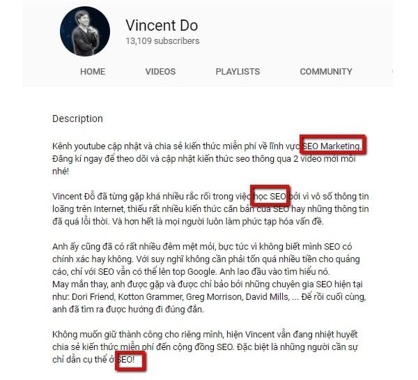 Ví dụ kênh YouTube của tôi chuyên chia sẻ về lĩnh vực SEO. Đương nhiên trong phần mô tả kênh, tôi cũng phải có tính liên kết với chủ đề SEO rồi.